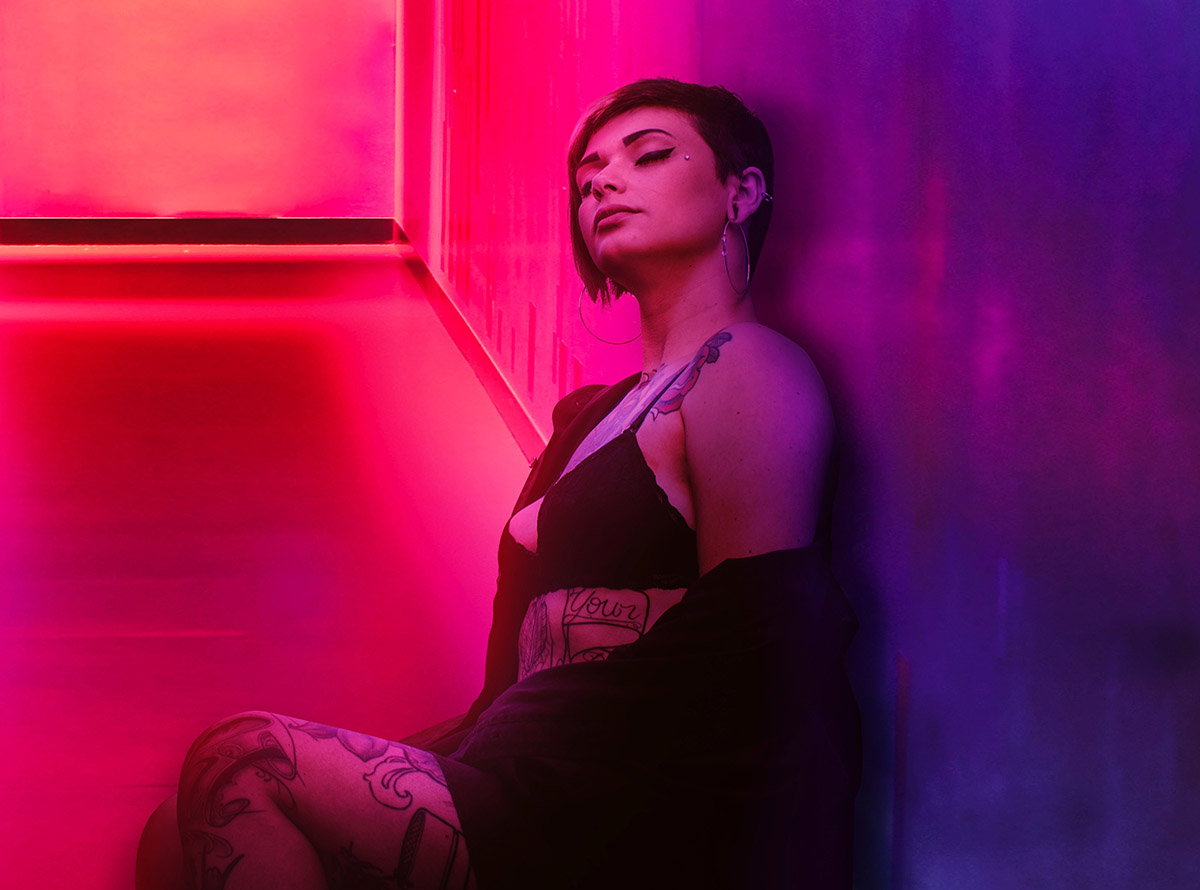 A beautiful woman posing against a yellow background